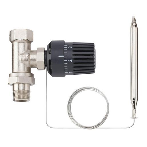 Ventil mit Thermostat und Fernfühler für die Regelung von Warmwasserheizregistern in lufttechnischen Anlagen. Zur stufenlosen Regelung einer konstanten Zuluft- oder Raumtemperatur, Einstellbereich 20 – 50 °C. Durchflussmenge bis 300 l/h.