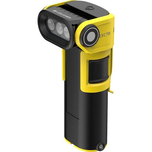 Robust, leistungsstark und sicher: Die EXC7R wurde speziell für Feuerwehrleute entwickelt und entspricht den Vorgaben der DIN-14649-Norm. Damit eignet sich die Winkelleuchte auch für anspruchsvolle Einsätze. Nach Bedarf kann zwischen fokussiertem Fernlicht und breit streuendem Flutlicht gewählt werden, um jederzeit die beste Beleuchtung zu garantieren. Der nach oben und unten schwenkbare Lampenkopf (135°) sowie der beidseitig anbringbare Clip sorgen für flexible Einsatzmöglichkeiten. Dank integriertem, kraftvollem Akku mit Laufzeit- und Ladestandsanzeige sind auch ausdauernde Einsätze kein Problem. Details wie die Reflektoren am Lampenkopf zur verbesserten Sichtbarkeit runden das Gesamtpaket ab. Explosionsschutz: Ex ia IIC T4 Ga, Ex ib IIIC T135 °C Db. | Garantie: bis zu 7 Jahre (bei Produktregistrierung). Gewicht mit Akku: 523 g. Maße (HBT): 187 x 87 x 73 mm. Gehäusematerial: Kunststoff (PC). Gehäusefarbe: schwarz. | Lichtleistung: bis zu 400 lm (240 m). Bis zu 40 Stunden Leuchtdauer bei 120 lm (30 m). Lichtfunktionen: Power, Mid Power, Low Power. Farbtemperatur: 4600 bis 5400 K. Farbwiedergabeindex (CRI): 70. | Schalter: Magnetschalter. Integrierter, durch Ledlenser-Kundenservice wechselbarer Li-Ion-Akku (3.7 V, 7600 mAh, 28.12 Wh). Aufladezeit: 450 min. Ladekabel und Ladeschale sind separat erhältlich. | Ex-Zone Gas 0. Gasgruppe IIA,IIB,IIC. Temperaturklasse Gas T4. Ex-Zone Staub 21. Staubgruppe IIIA,IIIB,IIIC. Max. Oberflächentemp. 135 °C. | Lieferumfang: Leuchte mit Akku, Taschenclip. Schutzklasse: IP68.
