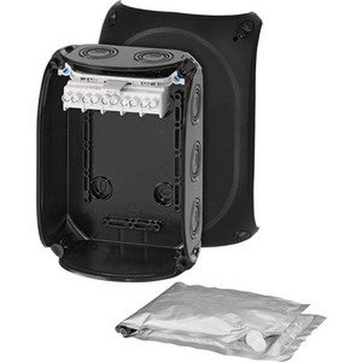 Kabelabzweigkasten aus hochwertigem Thermoplast zum Vergießen für eine wasserdichte Verbindung. Für die ungeschützte Installation im Freien bei Gefahr von Kondenswasserbildung und/oder Eintritt von Flüssigkeiten, zur Montage im Erdreich ohne Verkehrslasten. Verwendbar für Heizkabel / Heizband bis max. 70 °C Oberflächentemperatur. Für Nachinstallationen oder Prüfungen kann der Deckel abgenommen und die Vergussmasse entfernt werden. Deckelbefestigung über Schnellverschlüsse. Mit Außenlaschen zur Befestigung. Mit Klemmen bis 6 mm², 5-polig. Kabeleinführung über metrische Vorprägungen in Gehäusewänden. Anbau-Kabelstutzen im Zubehör. Mit Vergussmasse und Verschlussstopfen.