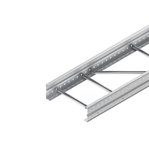Weitspannkabelleiter, nach DIN EN 61537, mit besonders stark ausgeprägten, durchgehend gelochten und gesickten Seitenholmen, sowie eingenieteten Sprossen aus C-Profil mit 16 mm Schlitzweite. Passende Bügelschellen (B… und BK…) finden Sie im KI-Katalog. Stoßstellenverbinder WSV 150.500 bitte gesondert bestellen. Abmessung (ca. Maße) H x B : 150 x 400 mm Materialstärke : 2 mm Sprossenabstand : 300 mm Seitenholmlochung : 9,5 x 13 mm Lochabstand : 50 mm Bodenlochung : Ø 5,4 mm Lochabstand : 50 mm Lieferlänge : 6000 mm Werkstoff : Stahl, bandverzinkt nach DIN EN 10346
