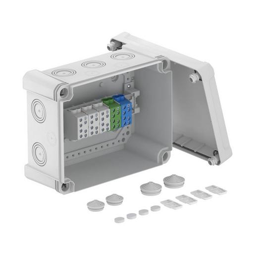 Kabelabzweigkasten zum Verbinden von Kabeln und Leitungen im Innen- und Außenbereich. Rechteckige Form mit Ausschlageinführungen. Geeignet für die Wand-/ Deckenmontage mit der Möglichkeit zur Außenbefestigung, Innenbefestigung oder Montage über die Eckdome. Besonders schlagfest mit IK09. Deckel mit Schnellverschluss, plombierbar. Hergestellt aus halogenfreien und UV-beständigen Materialien.Inklusive 5-poliger Hauptleitungsabzweigklemme, jede mit 2 x 25 mm² + 2 x 16 mm² Leiteranschlussquerschnitten pro Pol.Kabelabzweigkasten gemäß DIN EN 60670. Flammwidrig nach DIN EN 60695-2-11, Prüftemperatur 650°C. Schlagfestigkeit IK09 gemäß DIN EN 50102. Schutzart IP67 gemäß DIN EN 60529.