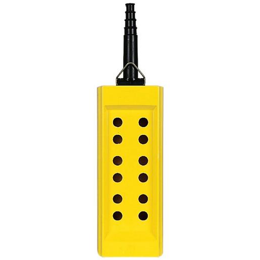 Leerer Hängetaster mit 12 Öffnungen in 2 Reihen. Diese Gelbe Steuerstation ist doppelt isoliert. Es gehört zur Baureihe der Hängetaster Harmony XAC für 22-mm-Kunststoff-Signaleinheiten mit Durchmesser.