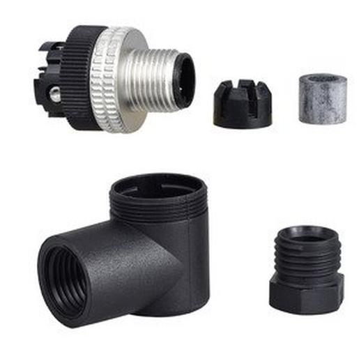 Dieser Steckverbinder hat einen abgewinkelten 4-poligen M12-Stecker und eine Schraubklemme mit Metallklemmringen. Er ist für kritische Installationen dank des hochrobusten M12-Metallringsteckers ausgelegt.