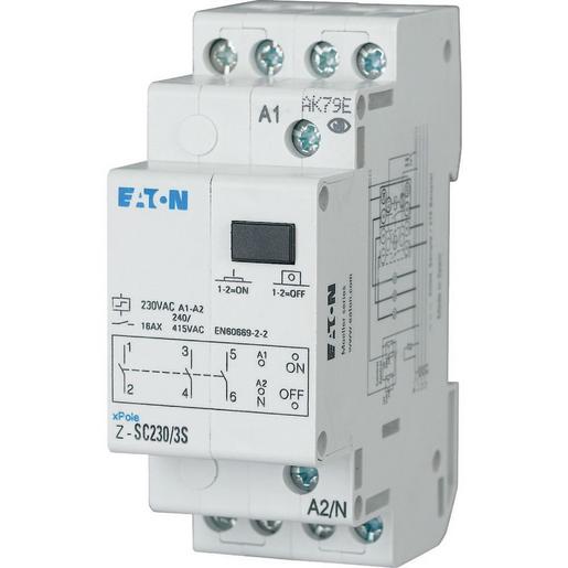 Stromstossschalter mit Zentralsteuerung, Steuerspannung 24V AC, Funktion: 1 Schliesser, Bemessungsstrom bei 250V AC nach IEC/EN 60669-2-2: 16A, Kappen-Einbaumaß 45mm, Einbaubreite 1TE (17,5mm), Hutschienenmontage, Klemmquerschnitt 0,5-10 qmm ein- und mehrdrähtig / 0,5-6 qmm feindrähtig mit Adernendhülse