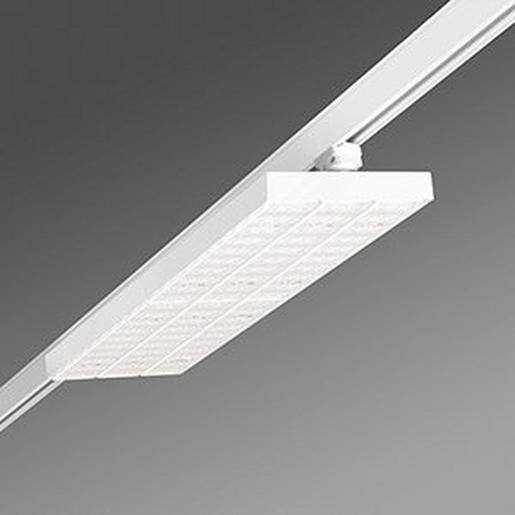 Stahlblechgehäuse pulverlackiert, rechteckiger Querschnitt, Gehäuserückseite mit integrierter Befestigung und Elektrischer Anschluß für die Dreiphasenstromschiene. Lichtverteilung direkt doppelt asymmetrisch strahlend mittels Individual. Lens. Optic aus Kunststoff PMMA. Elektronischer LED Dali Treiber integriert, Anschluss über DPSN 5-Phasen-Stromschienen-Adapter,.
