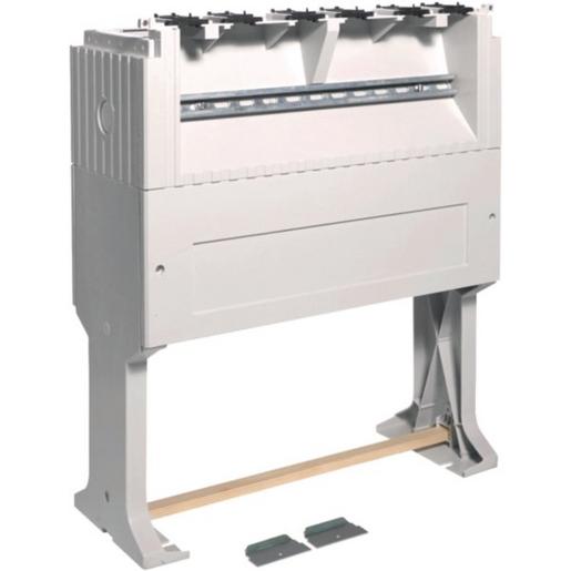 Festplatzsockel Größe 1, mit 6 Kabeleinführungen. Profilierter Festplatzsockel im Rippendesign, mit Steckschiebern und Abdeckungen sowie C-Profilschiene und Befestigungsschiene aus Winkelstahl 40 x 40 x 3 mm für Bügelschellen als Zugentlastung für Kabel. Seitlich vorgestanzte Öffnung von innen verschließbare, bei Öffnung ist eine Abdeckung d = 55 mm (Zubehör) einzubauen. Zur Betauungsvermeidung ist der Sockel bis zur Höhe der Kabelbefestigungsschiene innen mit Sockelfüller aufzufüllen. Zur Standfestigkeit ist ein Bodenrost empfohlen.