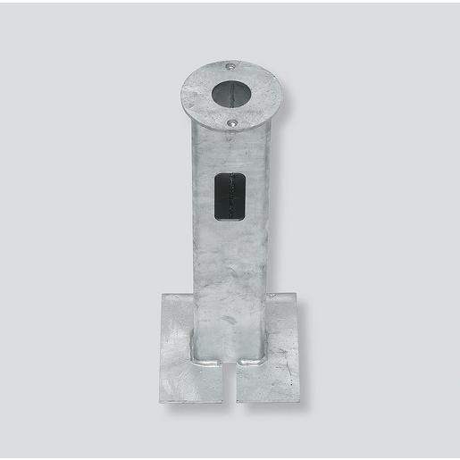 Zubehör-Erdstück zum Einbetonieren aus stabilem, feuerverzinktem Stahlprofil und innenliegender Kabeldurchführung und Bodenflansch mit aufgeschweißten Muttern zur Befestigung des entsprechenden Standrohres.