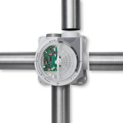 Zentralentlüftungsbox in kompakter Bauweise, mit vier Abluftansaugstutzen und einem Luftaustrittsstutzen Robustes Gehäuse aus schlagfestem Kunststoff, hellgrau. Die drei Ansaug- und der Luftaustrittsstutzen sind für Rohre der NW 100 und 125 ausgelegt (4 Reduzierungen im Lieferumfang enthalten). Ein Ansaugstutzen ist für Rohre der NW 100, 125 und 160 ausgelegt (1 asymmetrische Reduzierung von NW 160 auf NW 125 im Lieferumfang enthalten). Ventilatorbetrieb in drei Stufen mittels Betriebsschalter DSZ (Zubehör) möglich. Zur individuellen Leistungsanpassung stehen neun Drehzahlen durch DIP-Switches auf der Antriebselektronik zur Verfügung. Geräuscharmes Radial-Laufrad aus Stahl in aerodynamisch optimierter Spirale. Einströmung über Düse. Energiesparender elektronisch kommutierter Gleichstrom-Außenläufer-Motor mit Kugellager für Dauerbetrieb. Hoher Wirkungsgrad auch bei Regelbetrieb. Wartungs- und funkstörfrei.