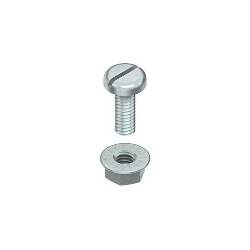 Flachkopfschraube mit Schlitz nach DIN EN ISO 1580, inklusive verzahnter Flanschmutter nach DIN EN 1661, zur Sicherungsverschraubung der Gitterrinnen mit dem Gitterrinnenabhängebügel GRAB 10…. Abmessung (ca. Maße) Gewinde : M 6 Länge : 16 mm Werkstoff : Stahl, galvanisch verzinkt nach DIN EN ISO 4042, blaupassiviert