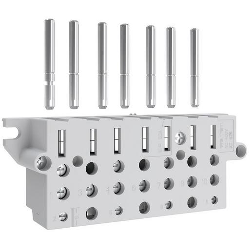 Zählersteckklemme mit Steckstifte für 3 Phasen Drehstrom, geprüft nach DIN VDE 0603-3-3, für das schraublose Wechseln von haushaltsübliche Bezugszähler (63 A) in 3-Punkt-Befestigung, Klemmenquerschnitt bis 16 mm², Steuerleitungsabgriff pro Phasen- und N-Klemme, Set mit 7 Kontaktstiften mit Arretierung N-Stift 6x 45 mm und 1x 45 mm