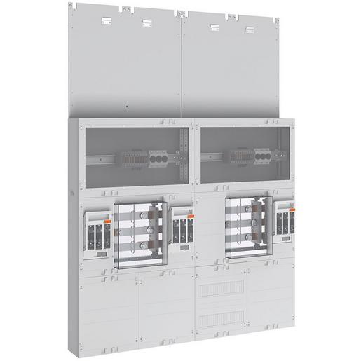 Zähler-Wandlerfeld 2×100 A Eigenverbrauchsmessung nach TAB Rheinische NETZGesellschaft bestehend aus: 2x Aufnahme für Zählerwechselplatte 450 mm Breite und 520 mm Höhe, 2x Wandlerzusatzraum 300 mm 24 TE mit Klarsichtabdeckung und höhenverstellbarer Gerätetragschiene bestückt mit Spannungspfadsicherungen und Wandler-Trennklemmen, 1x NAR 300 mm mit NH00 Trenner und N/PE Anschluss, 2x Wandlermodul mit Wandlerlaschen Bauform A mit 30 x 5 mm, 2x AAR mitte Bezugsstrom und rechts Einspeisung mit NH00 Trenner, N und PE Schiene im AAR 12 x 10 mm, 4x Sammelschienenklemme 70 mm², 4x Sammelschienenklemme 35 mm²
